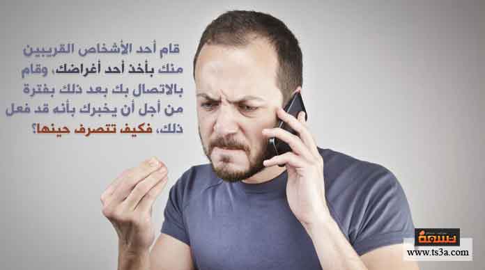 1. قام أحد الأشخاص القريبين منك بأخذ أحد أغراضك، وقام بالاتصال بك بعد ذلك بفترة من أجل أن يخبرك بأنه قد فعل ذلك، فكيف تتصرف حينها؟