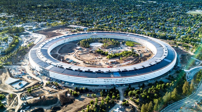 على مساحة 79000 متر مربع، تم إنشاء شركة آبل في كوبيرتينو، في كاليفورنيا، في أمريكا، وتسمى هذه المنطقة بوادي السيليكون، نسبة لوجود عدد كبير من مصنعي رقائق السيليكون هناك، وتضم المنطقة شركات التكنولوجيا الضخمة وفي منتصف هذه الشركات يقع مقر آبل في الشارع الأول، إنفينيت لوب، ويتكون مقر الشركة من ستة مبان ضخمة تم تصميمهم من قبل شركة سوبراتو، وذلك في عام 1993، بالرغم من تأسيس الشركة قبل هذا التاريخ بحوالي 20 عاما، إلا أنها تأسست في مكان صغير كمعظم الشركات الضخمة، ومع تقدم الوقت وزيادة مبيعات آبل من أجهزة الماكنتوش وغيرها استطاعت أن تقوم بعمل هذا المقر الحالي، وعند النظر لشكل المقر، نجد أن مقر آبل على شكل دائرة زجاجية، وتم صرف خمس مليارات دولار لبنائه، واليوم حولت الشركة هذا المقر لمزار سياحي ضخم يقصده العديد من عشاق آبل، كما وضعت بداخله الكثير من المتاجر والأنشطة الترفيهية ليصب كل هذا في مصلحة مبيعات آبل وأسهمها.