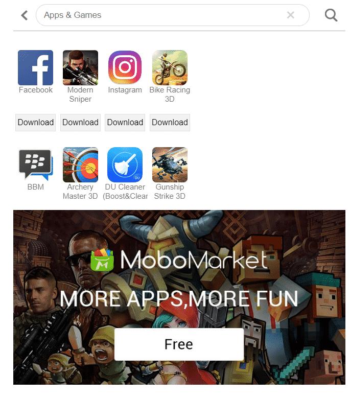 بمجرد تحميلك لبرنامج موبو ماركت فقد أصبح لديك القدرة على تحميل ملايين التطبيقات والألعاب، وحتى التطبيقات العادية الشهيرة مثل تطبيقات التواصل الاجتماعي كفيسبوك وتوتير وإنستجرام ستجدها متاحة مجاناً، فضلاً عن وجود نسخ غير أصلية من تطبيقات التواصل الاجتماعي مثل واتس آب جولد التي لن تجدها على متجر جوجل بلاي.