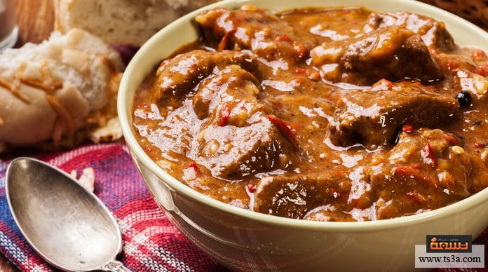 اغسلي اللحم جيدًا بالماء البار ثم قطعيه إلى أجزاء متوسطة الحجم، وفي إناء على النار ضعي القليل من الزيت وعليه البصل وقلبيهم معًا ثم ضعي اللحم وورق الغار، وقلبي اللحم مع البصل حتى يتحول لون اللحم من الأحمر إلى البني، ثم اسكبي المياه عليها واتركيها حتى الغليان، ثم انقلي الإناء إلى نار هادئة واتركيها لمدة 45 دقيقة حتى ينضج اللحم.